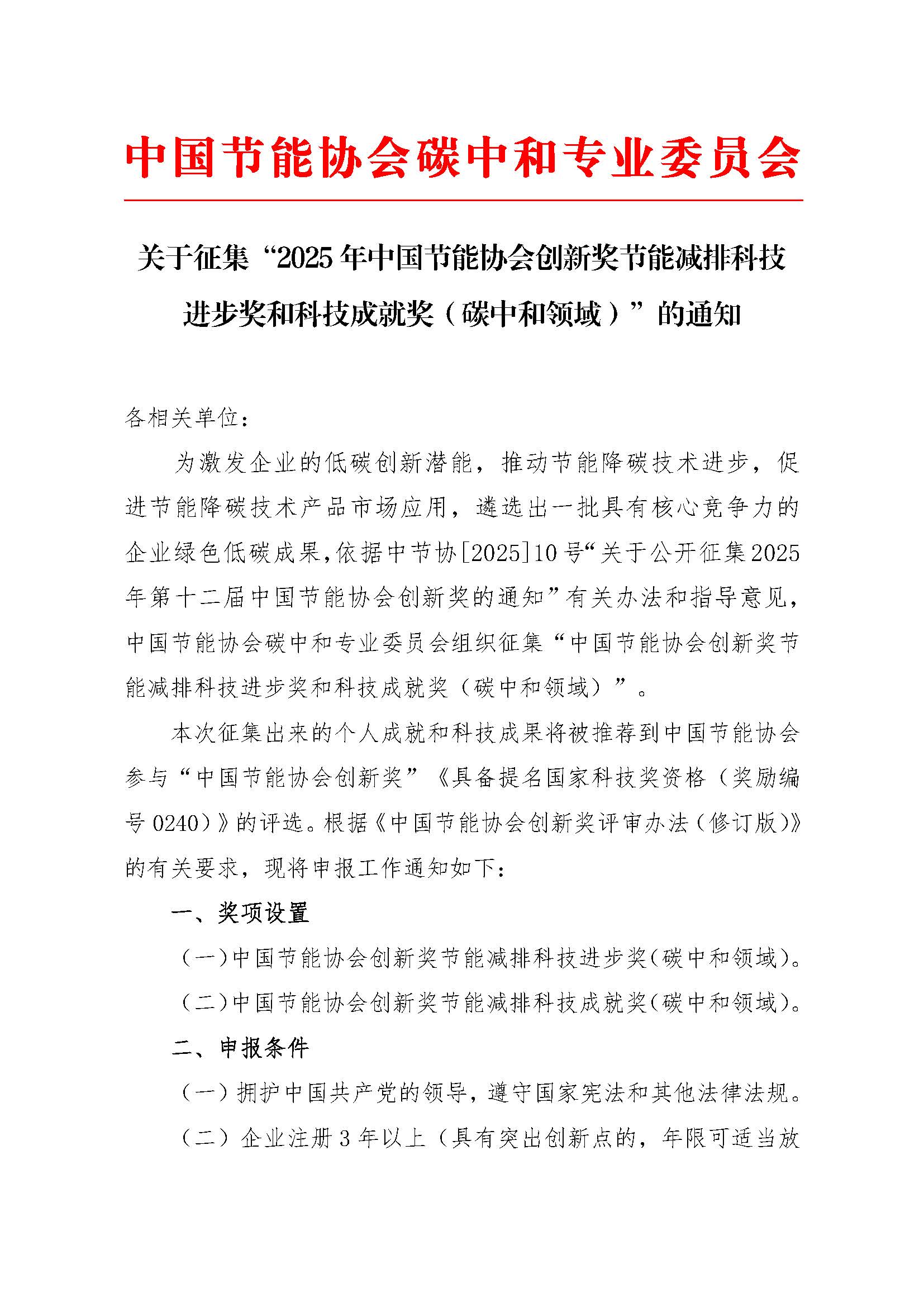 关于征集“2025 年中国节能协会创新奖节能减排科技 进步奖和科技成就奖(碳中和领域)”的通知