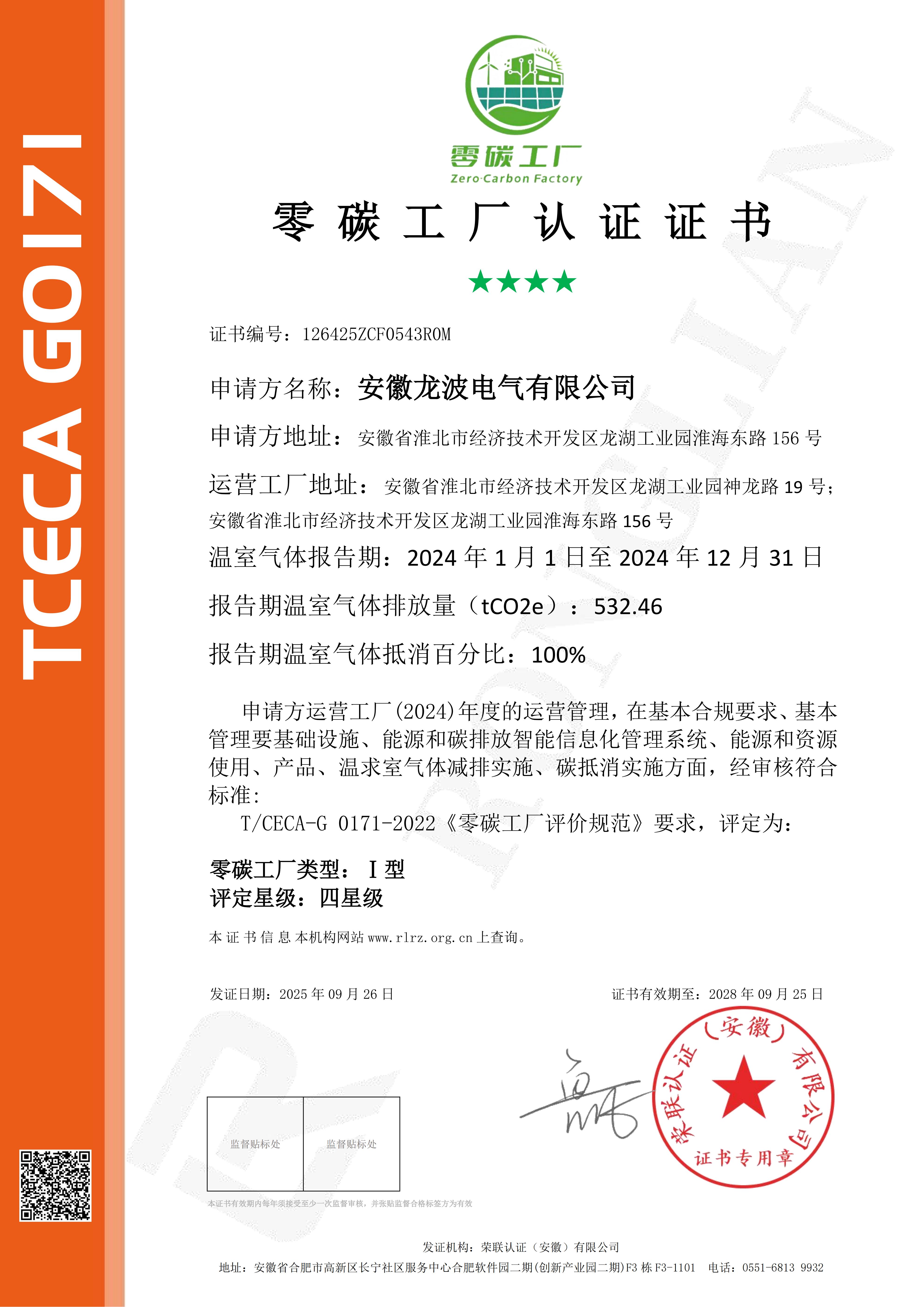 安徽龙波电气有限公司经荣联认证(安徽)有限公司核查后达到Ⅰ型四星级零碳工厂等级,获得零碳工厂认证。